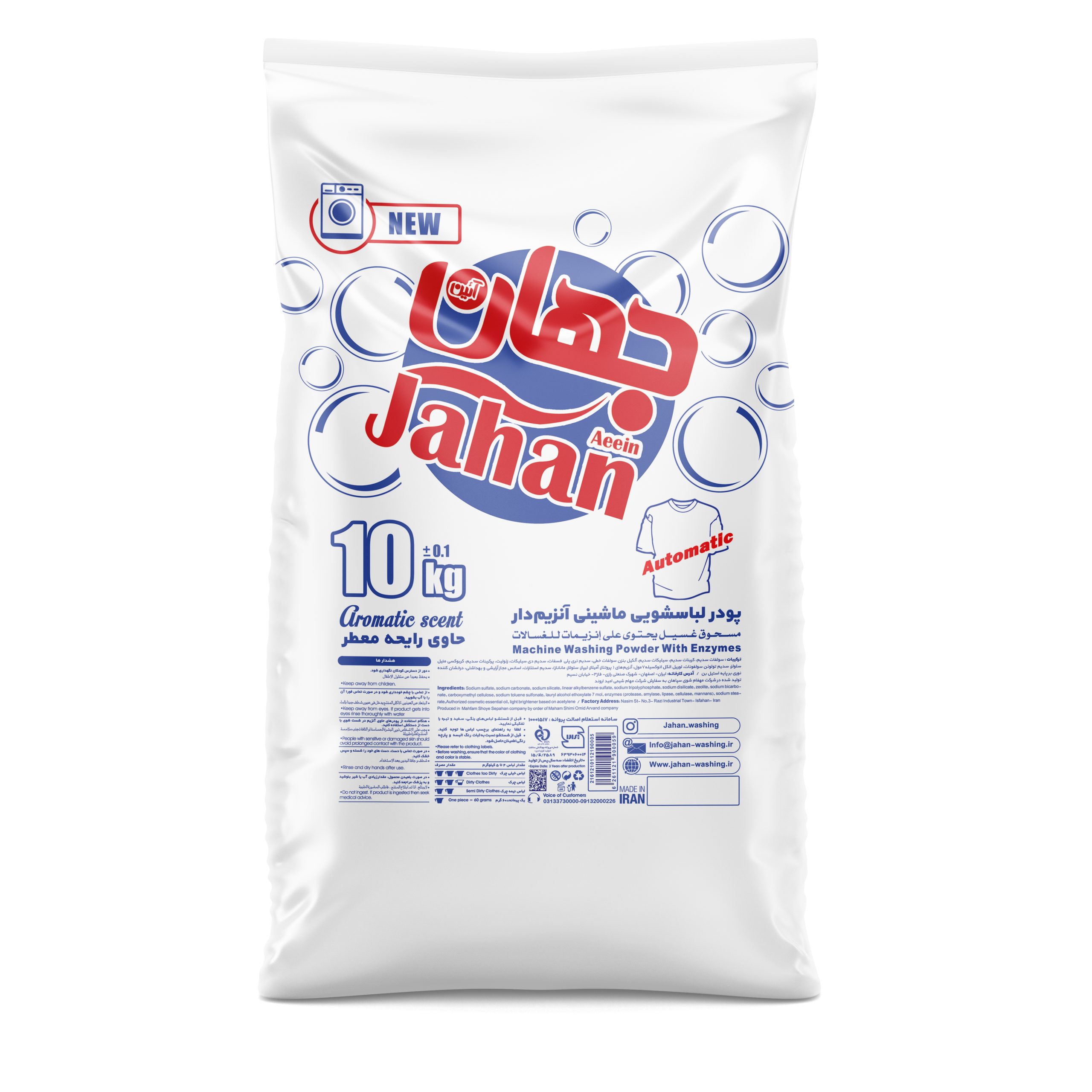 پودر ماشین لباسشویی جهان در بستهبندی ۱۰ کیلویی مقاوم و ضد رطوبت عرضه میشود.